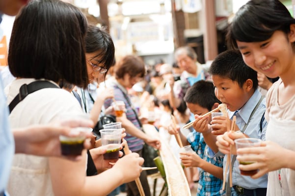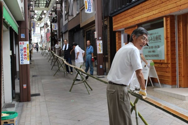 下御門商店街の特徴は高低差が約5mもある坂道。それをいかして行う全長80mの流しそうめん大会「しもみかど流しそうめん」は、2012年から始まりました。その他にも「写真でつづるしもみかど商店街」「SHOW天GAI∞(ショウテンガイエイト)」など様々なイベントで地域活性化に取り組みました。